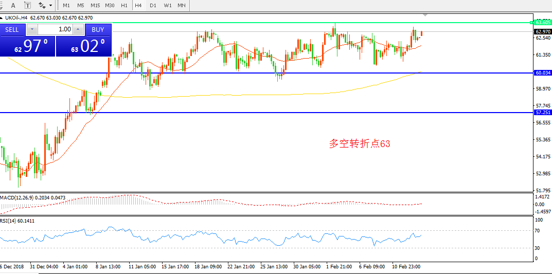 4小时图看,油价处于窄幅震荡形态,均线系统逐渐粘合形成支撑, MACD红柱逐渐减少,短期走势预计在60-63美元之间震荡为主。