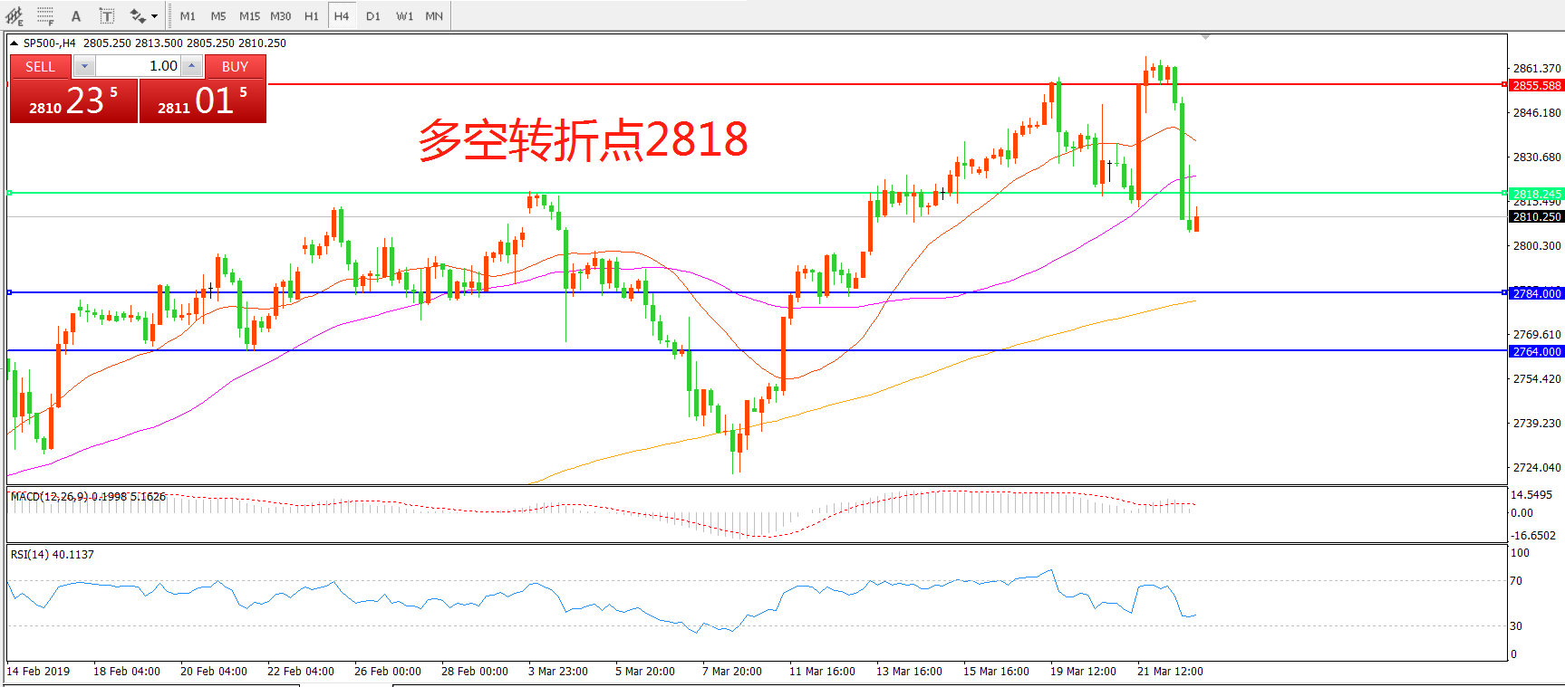4小时图看,标普500在突破2855后快速回落, 长阴下破后击穿2818支撑,短期均线拐头向下,MACD红柱减少,日内延续下行概率较大。