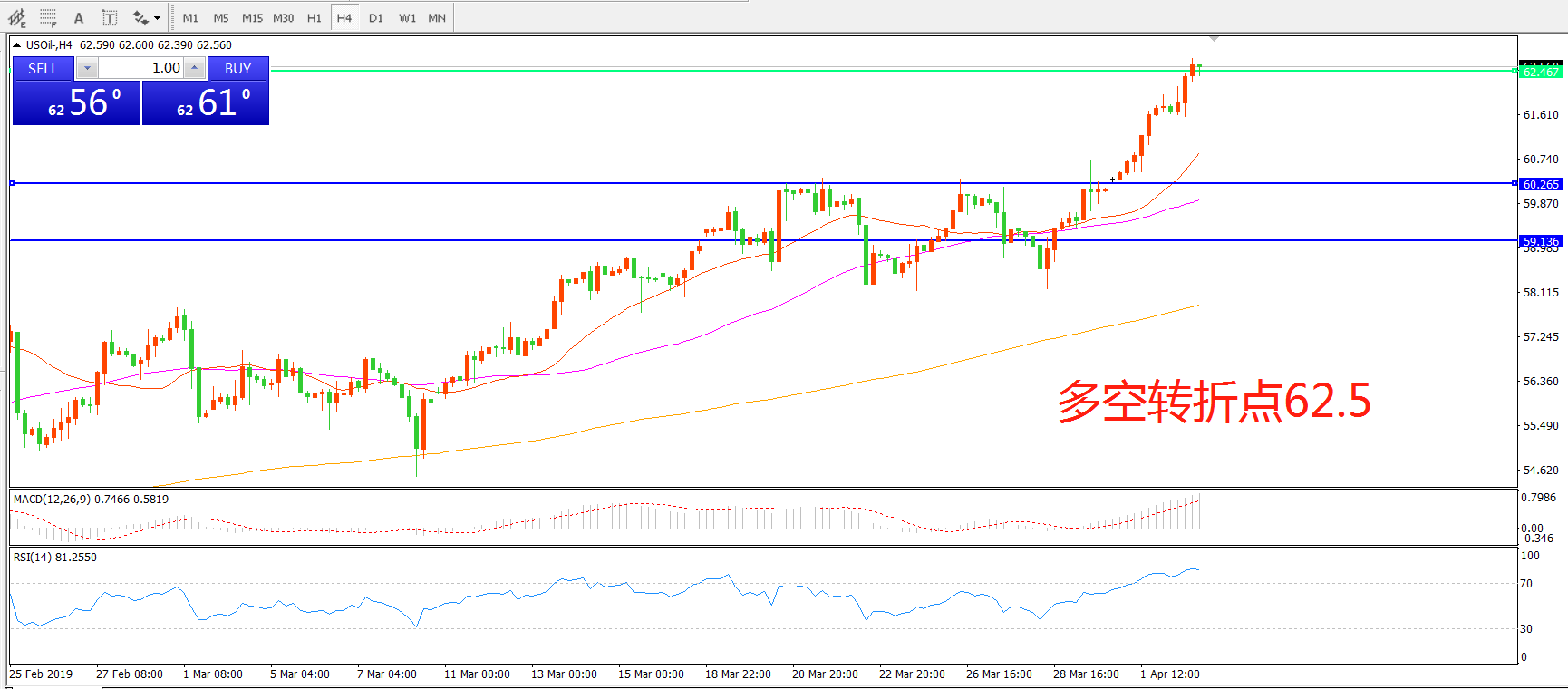 中国公布的3月制造业PMI指数显示,增幅创8个月新高,重回荣枯线上方,与此同时,美国将可能将加大对石油产出大国伊朗的制裁,利好油价。美国政府一名高级官员周一对路透记者表示,可能不会延长下月到期的对伊朗石油出口的制裁豁免,并考虑施更多制裁。美国WTI原油周二(4月2日)收涨0.99美元,报62.58美元/桶。美国石油协会(API)公布原油库存数据增加300万桶,远高于预期,今晚22:30,EIA库存数据将再度袭来,目前市场预期减少117.5万桶,重点关注。