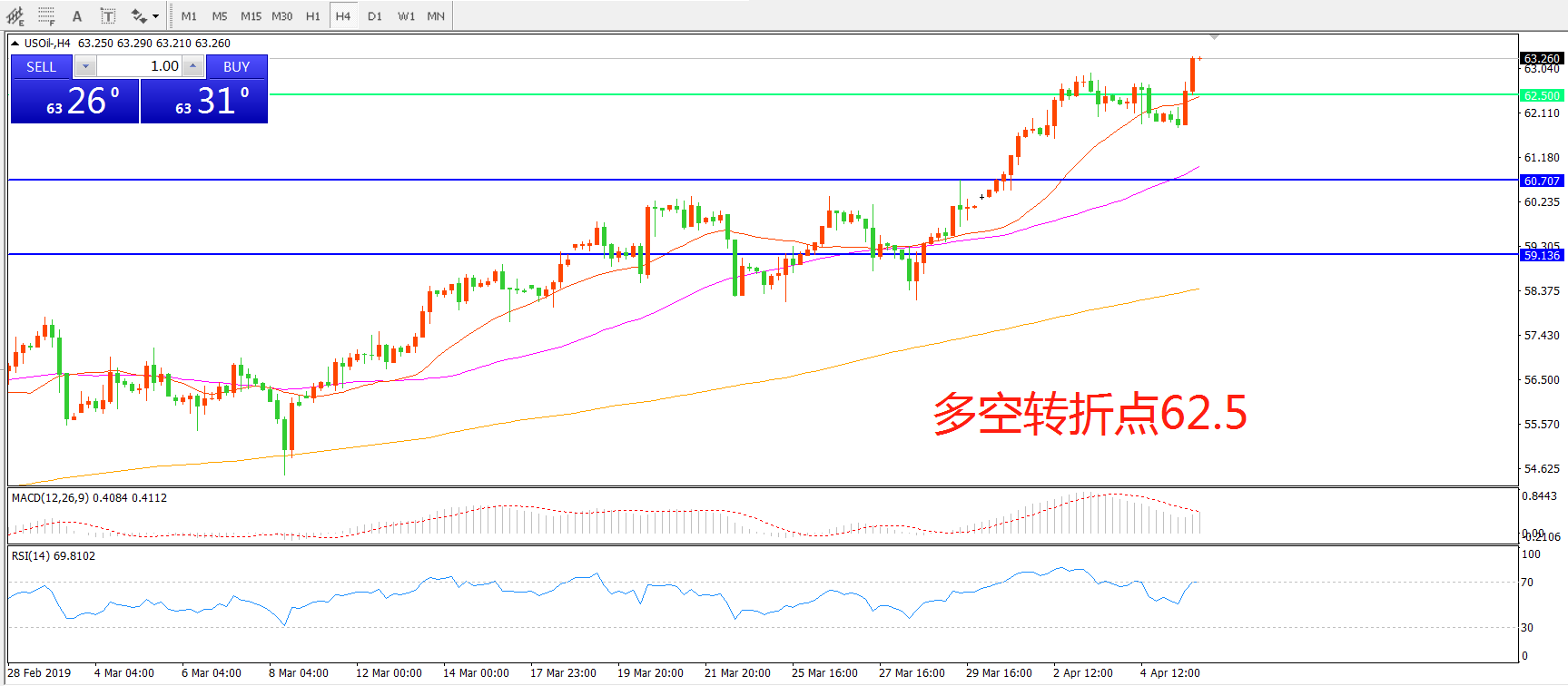 4小时图看,油价强势突破62.5美元,短期走势偏强,均线系统呈多头排列,MACD红柱缩短,RSI指标走平,日内延续上行概率较大。