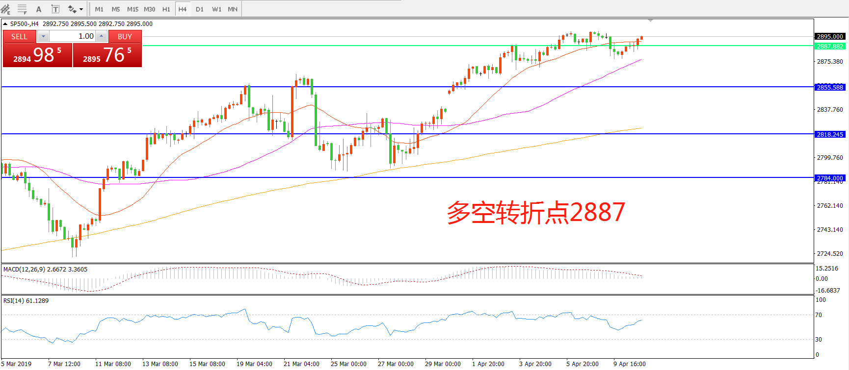 4小时图看,标普500震荡后延续上行,21周期均线成为短期支撑, MACD红柱缩短,RSI指标向上,日内以震荡思路对待。