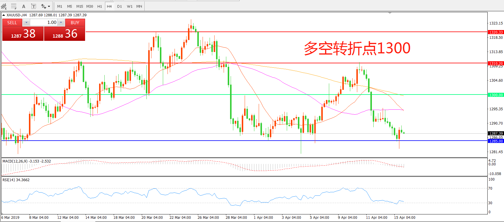 4小时图看,金价整体呈现呈现弱势震荡,21周期均线下穿55周期形成死叉,短期走势偏弱,MACD红柱缩短,日内重点关注1285一线支撑。