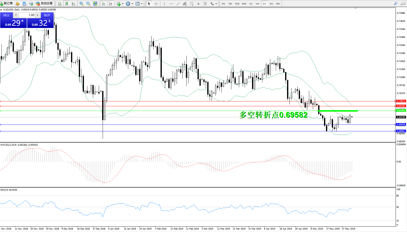 交易策略:0.69582下方看跌,目标0.68958、0.68662