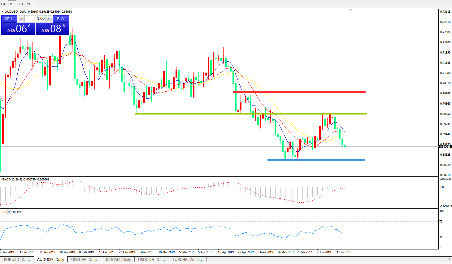 技术面简析:日图均线粘合有形成死叉迹象,价格持续回落,MACD0轴下方有放量迹象,RSI持续走低,预计汇价将继续走低试探前低。