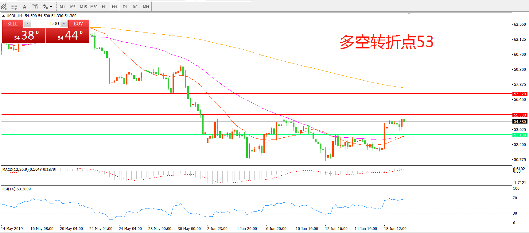 周三(6月19日)美联储宣布维持2.25-2.50%的利率不变,但在决议中内容明显转鸽,放弃了之前的声明中对未来的政策调整保持“耐心”的措辞,还称未来经济前景不确定性增加,消息公布后, 美元指数短线下跌20余点,而美国能源信息署(EIA))公布报告显示,截至6月14日当周,美国原油库存减少310.6万桶至4.824亿桶,降幅创5月10日当周(6周)以来最大,美油震荡反弹,最终收报54.51美元/桶。值得注意的是,石油输出国组织(OPEC)关于下次政策会议举行时间的争论终于告一段落,同意将原定于6月25日-26日举行的政策会议推迟至7月1日-2日。