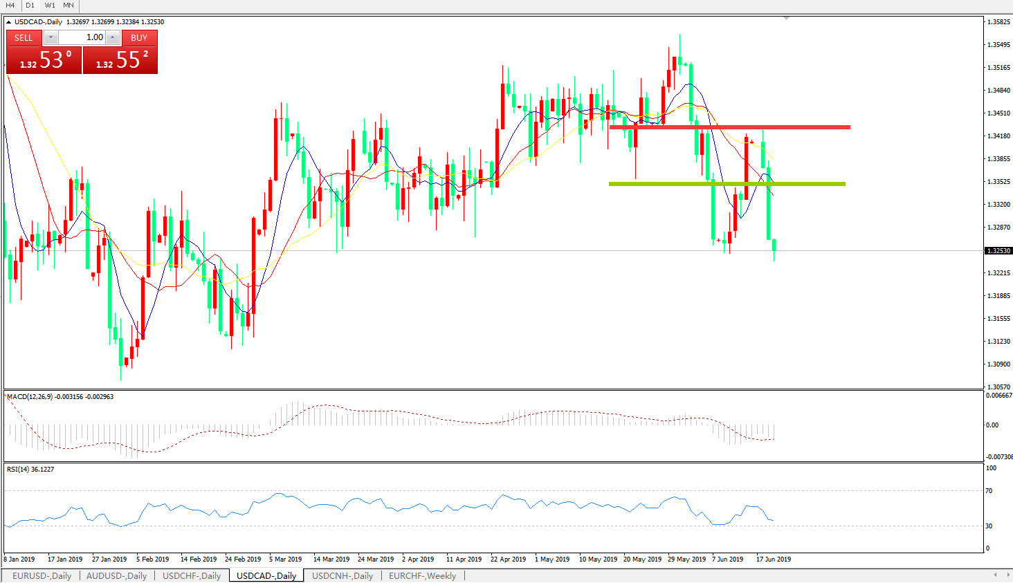 技术面简析:日线图均线开始再度下行,价格快速跌穿多空转折区域及前低点,MACD在0轴下方运行且动能柱再度放量,RSI反弹后逐步走低,预计汇价将进一步下行。