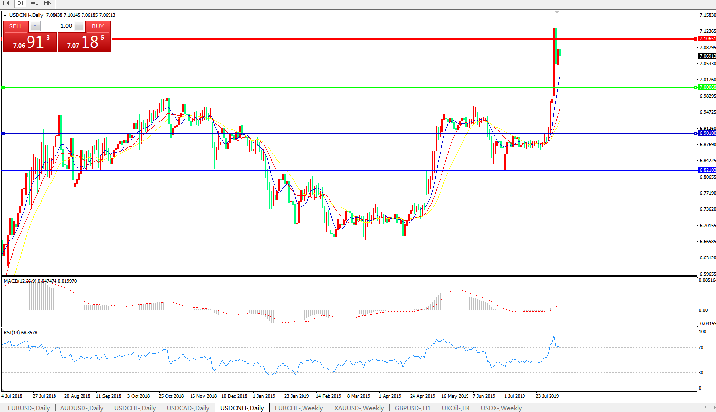 在岸人民币周三(8月7日)再度收跌近百点,至7.04上方,中间价则再跌逾300点逼近7元关口,两者同创逾11年新低。交易员称,市场继续消化此前全面贸易环境波动所带来的冲击,但央行发行离岸央票,打破了离岸带动在岸下跌的反馈机制,加之近两日长端掉期大行卖压较重,均缓和了人民币跌势,市场情绪总体平稳,短期料维持在7.05附近宽幅波动。交易员并表示,人民币此轮下跌是基本面驱动的顺势调整,如果此后有利多的消息出现,不排除人民币再进入6时代,如此一来整数关口的心理意义将会被进一步淡化。如果欧美时段美指保持基本稳定,明日中间价很可能会站上7,但对市场情绪的影响总体可控,指标性程度已被淡化。中国外管局最新公布的外储数据显示,7月末外储结束两连升,当月下降155亿美元,为九个月最大单月降幅。外管局发言人称,7月中国外汇市场运行保持平稳,外储规模变动主要受汇率折算和资产价格变化等因素综合影响。