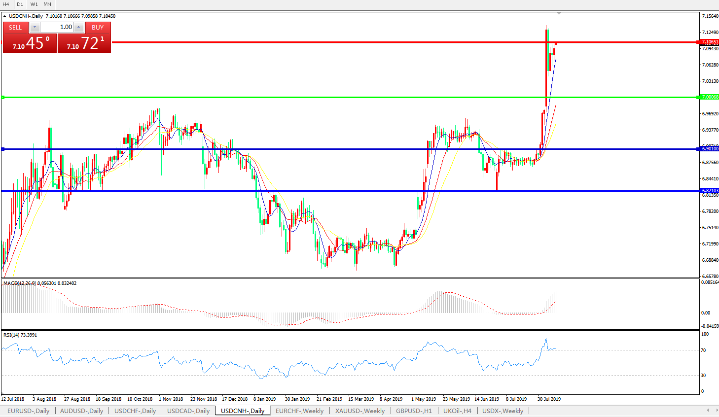 美元兑人民币USDCNH 日线图: