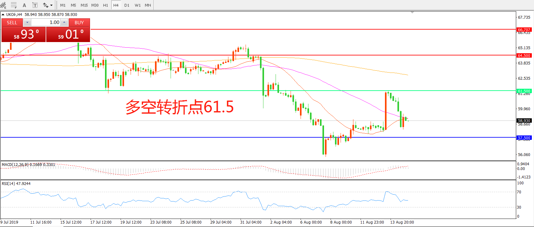 周三(8月14日),美国EIA公布的数据显示,截至8月9日当周美国除却战略储备的商业原油库存增幅超过预期,汽油和精炼油库存大幅减少,整体表现差强人意。但美国2年期和10年期国债收益率曲线自2007年来首次出现倒挂,中国最新出炉的7月工业和消费数据也均逊于预期引发市场对世界经济衰退的担忧,布伦特原油大幅下跌,收报58.95美元/桶。