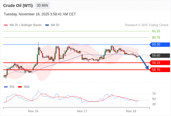 在 60.30 之下,看跌,目标价位为 59.15 ,然后为 58.70 。