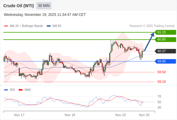 在 59.95 之上,看涨,目标价位为 60.85 ,然后为 61.15 。