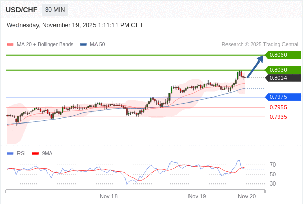 在 0.7975 之上,看涨,目标价位为 0.8030 ,然后为 0.8060 。