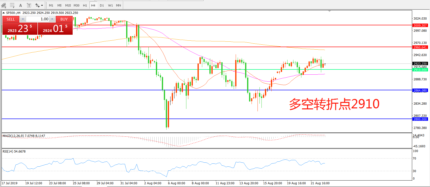 周四美股全线高开,随后市场对于经济衰退的担忧令三大股指集体转跌,标普500震荡后收报2922.50点,美国8月Markit制造业PMI初值降至49.9,为2009年9月以来首次跌至50荣枯线下方。制造业调查数据提供了一个明确的信号,美国第三季度经济增长将继续放缓。杰克逊霍尔央行年会召开在即,市场仍在等待美联储主席在杰克森霍尔研讨会上可能提供的进一步线索。