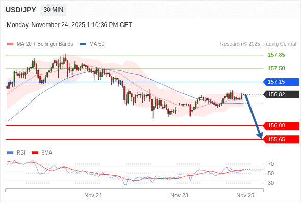 在 157.15 之下,看跌,目标价位为 156.00 ,然后为 155.65 。