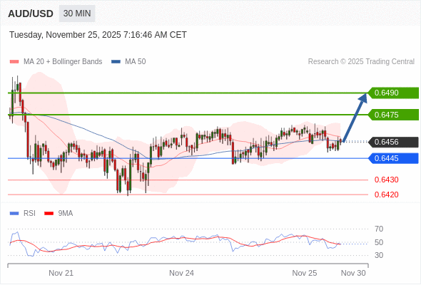 在 0.6445 之上,看涨,目标价位为 0.6475 ,然后为 0.6490 。