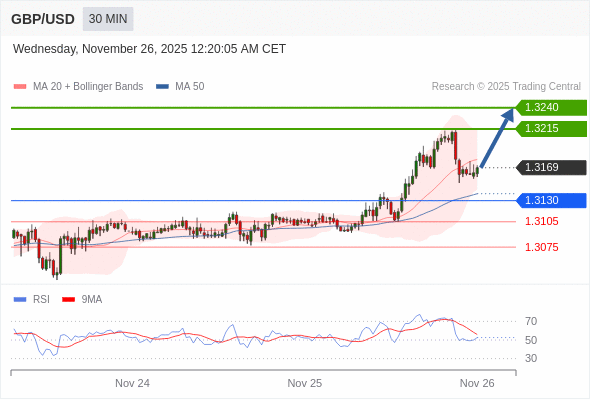 在 1.3130 之上,看涨,目标价位为 1.3215 ,然后为 1.3240 。