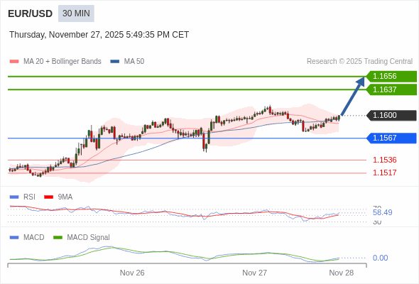欧元/美元 当日内 : 看涨,当 1.1567 为支撑位。