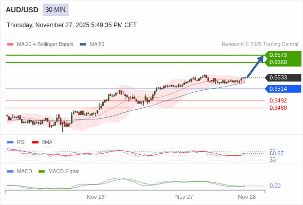 澳元/美元 当日内 : 看涨,当 0.6514 为支撑位。