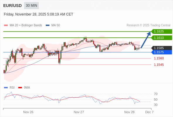 在 1.1575 之上,看涨,目标价位为 1.1610 ,然后为 1.1625 。