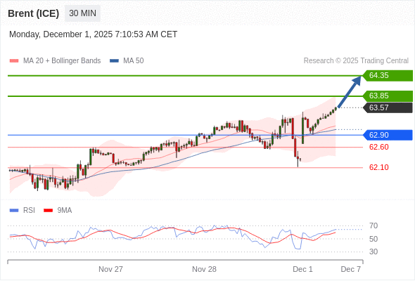 在 62.90 之上,看涨,目标价位为 63.85 ,然后为 64.35 。