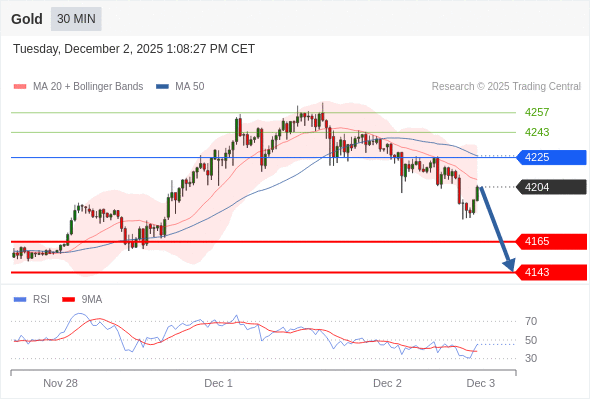 在 4225 之下,看跌,目标价位为 4165 ,然后为 4143 。