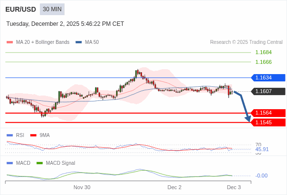 欧元/美元 当日内 : 看跌,在 1.1634 之下。