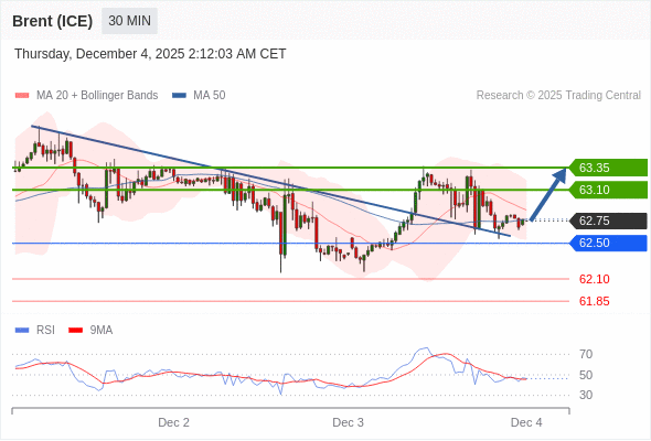 在 62.50 之上,看涨,目标价位为 63.10 ,然后为 63.35 。
