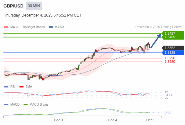 英镑/美元 当日内 : 看涨,当 1.3328 为支撑位。