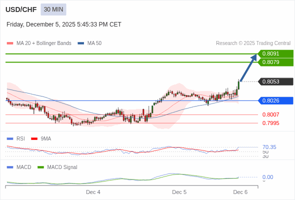 美元/瑞郎 当日内 : 看涨,当 0.8026 为支撑位。