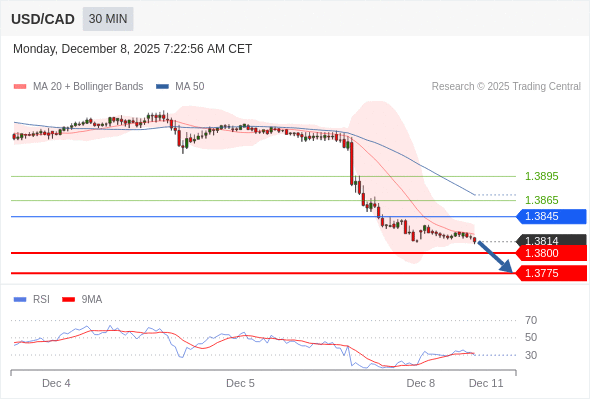 在 1.3845 之下,看跌,目标价位为 1.3800 ,然后为 1.3775 。