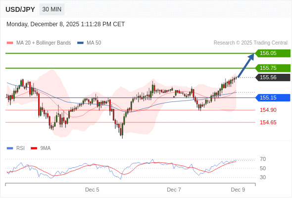 在 155.15 之上,看涨,目标价位为 155.75 ,然后为 156.05 。