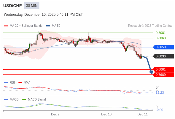 美元/瑞郎 当日内 : 看跌,在 0.8050 之下。