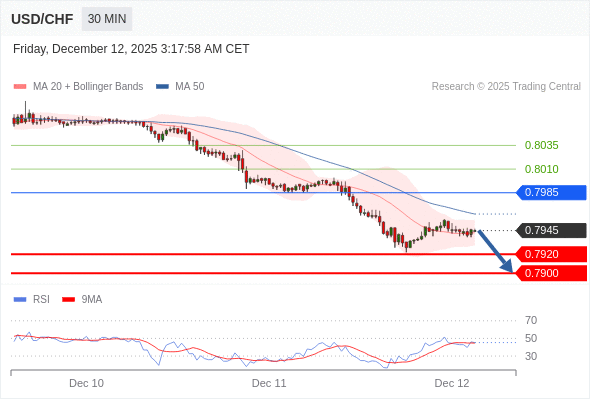交易策略: 在 0.7985 之下,看跌,目标价位为 0.7920 ,然后为 0.7900 。