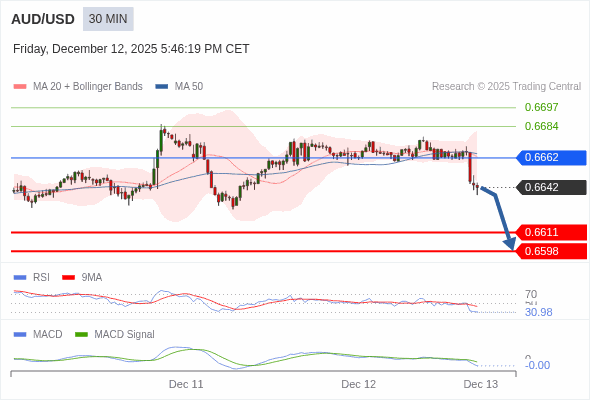澳元/美元 当日内 : 看跌,在 0.6662 之下。