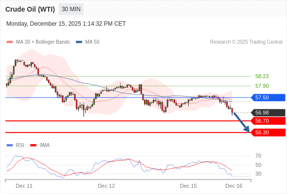 在 57.50 之下,看跌,目标价位为 56.70 ,然后为 56.30 。