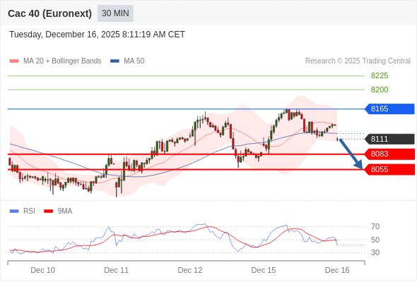法国CAC指数期货 (Euronext) (Z5) 当日内: 短期关键阻力位在8165。