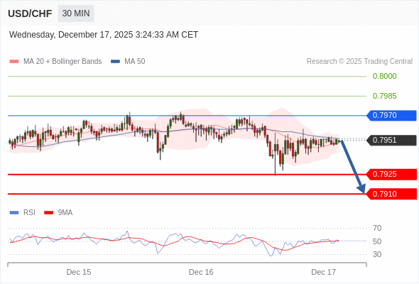 在 0.7970 之下,看跌,目标价位为 0.7925 ,然后为 0.7910 。