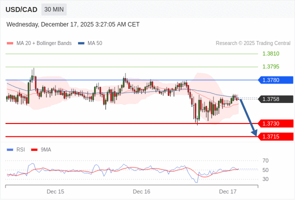 在 1.3780 之下,看跌,目标价位为 1.3730 ,然后为 1.3715 。