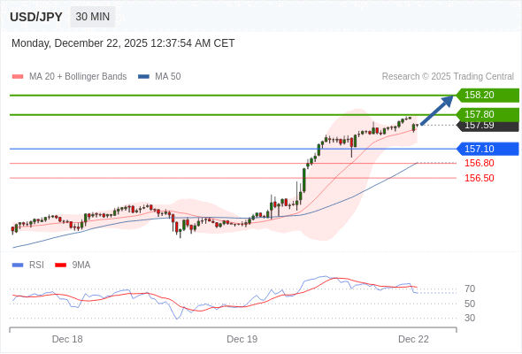 在 157.10 之上,看涨,目标价位为 157.80 ,然后为 158.20 。