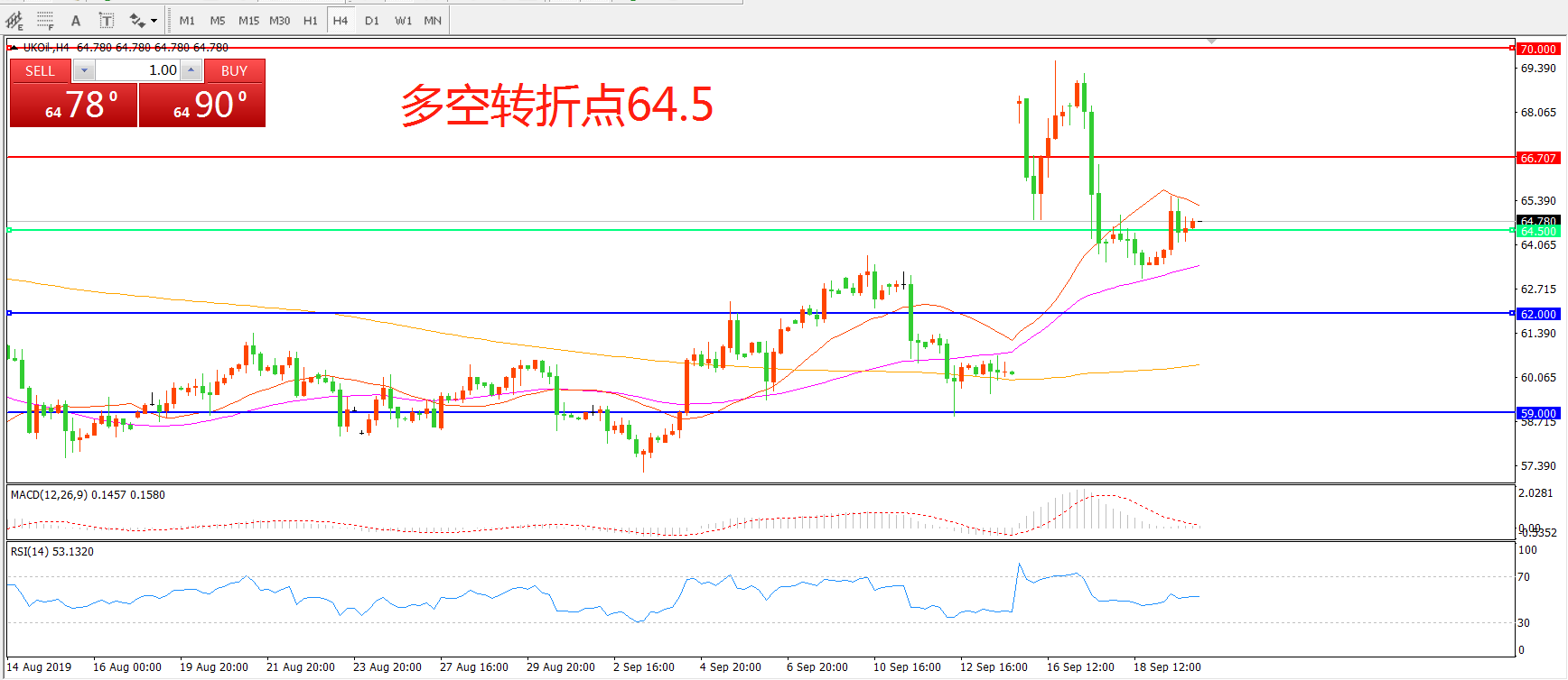 周四(9月19日)布伦特原油整体维持窄幅震荡,小幅收涨,报64.78美元/桶。沙特原油设施遇袭事件继续扰动市场,由于沙特产量的恢复速度快于预期令油价随后回吐部分涨幅。但日内来看,供应面压力依然存在,或许为油价继续带来利好。