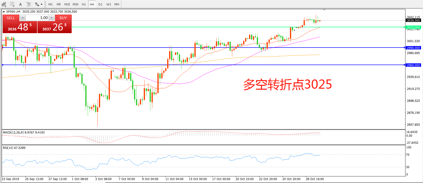 周二(10月29日),标普500指数在创出历史新高后小幅回落,收报3035.23点。近来美国股市迎来了一系列公司财报的公布,而大部分公司财报优于预期,支撑了市场风险偏好。美联储从周二开始召开为期两天的货币政策会议,市场普遍预计美联储将在周三宣布降息25个基点,一旦在这个过程中鲍威尔释放了任何鹰派的信号,都有可能美股形成重大冲击,务必重点关注。