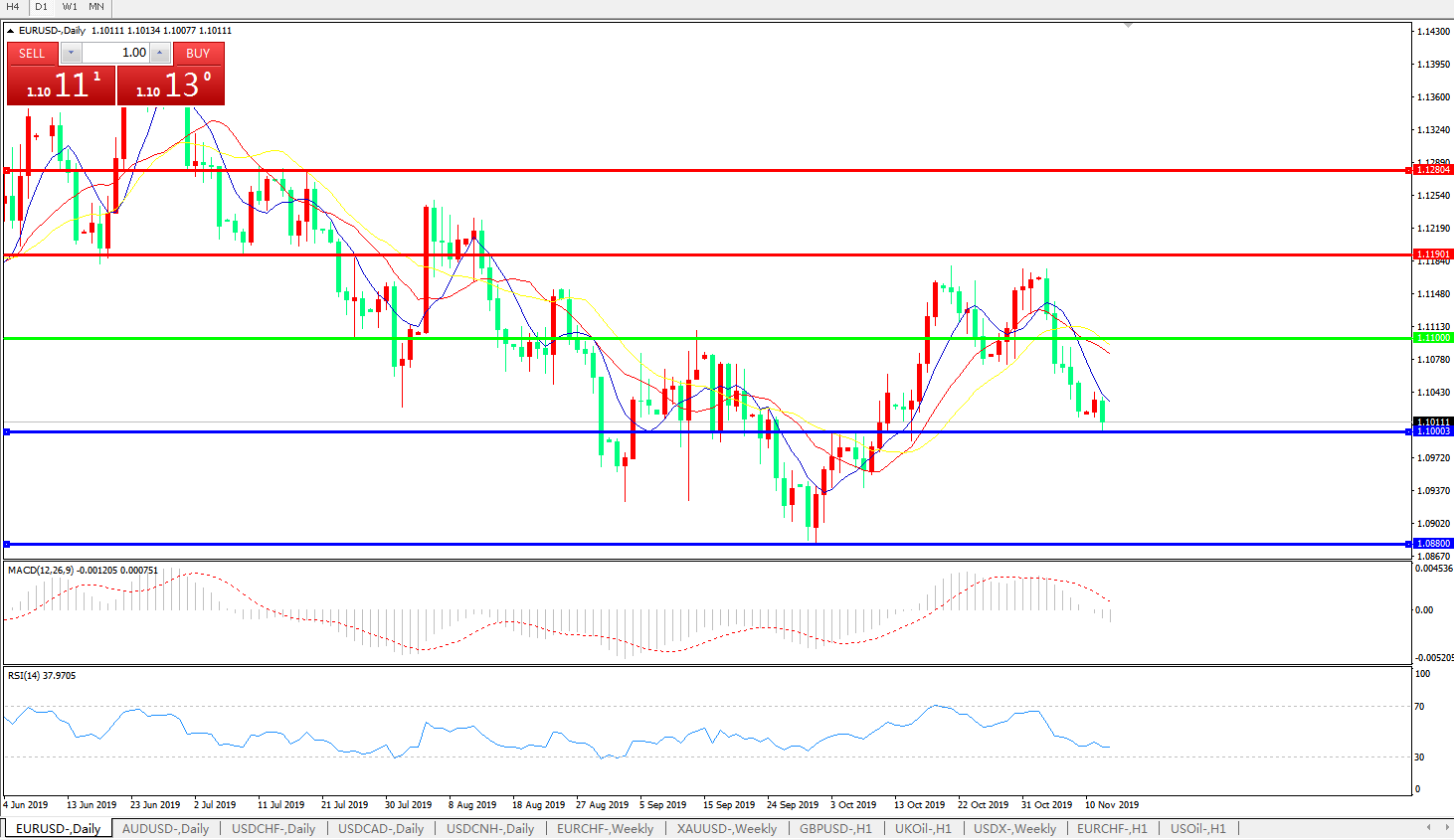 欧元兑美元在周二欧洲时段延续跌势,最低触及1.1015,为10月15日以来整四周新低。上周以来欧元兑美元的下行趋势仍在延续,虽然日内经济数据表现向好,但却于事无补; 德国11月ZEW经济信心指数由10月的-22.8回升至-2.1,远好于预期的-13.0,但投资者经解读后认为,与其说当月的数据向好,不如说是上月的数据,及受其悲观影响之后的预期值过低,而数据本身仍处于负区间典故状况很难说是真正靓丽;在此状况下,欧元汇价仍受负面情绪打压。投资者继续押注欧洲央行之后会有进一步的宽松政策预期,相反,在全球贸易局势趋向乐观的背景下,相比欧元区前景,投资者更加看好美国经济未来表现,大西洋两岸的经济基本面落差因而继续左右着市场情绪。 眼下,欧元汇价也再度来到了1.10心理关口,一旦失守,下方将打开跌至1.0920的下行空间