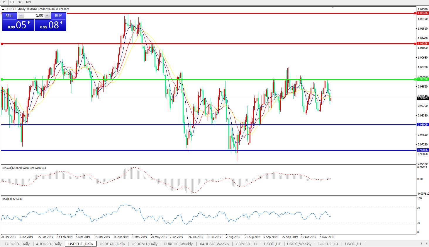 美元兑瑞郎在周三日内承压走低,因在美国总统特朗普隔夜讲话的措辞不甚积极之后,市场避险情绪重新升温,令避险货币瑞郎再度迎来大量买需。全球投资者对于贸易环境前景仍有疑虑,且从OECDIMF等机构得到的数据也显示全球经济仍有下行压力; 在此状况下,瑞士央行行长乔丹日内发表的鸽派讲话惨遭市场无视。尽管他再度强调负利率政策有充分的必要性,且央行仍做好了随时入市干预汇率的准备,但在市场情绪由喜转忧的大背景之下,美元兑瑞郎并未因此而有任何显著反弹,反而进一步加深跌势;美元兑瑞郎因此失守0.99关口,跌至一周多低点0.9894,下方或挑战0.9879处的100日均线支撑位。市场正关注美联储主席鲍威尔日内稍后讲话对汇市走向的进一步指引