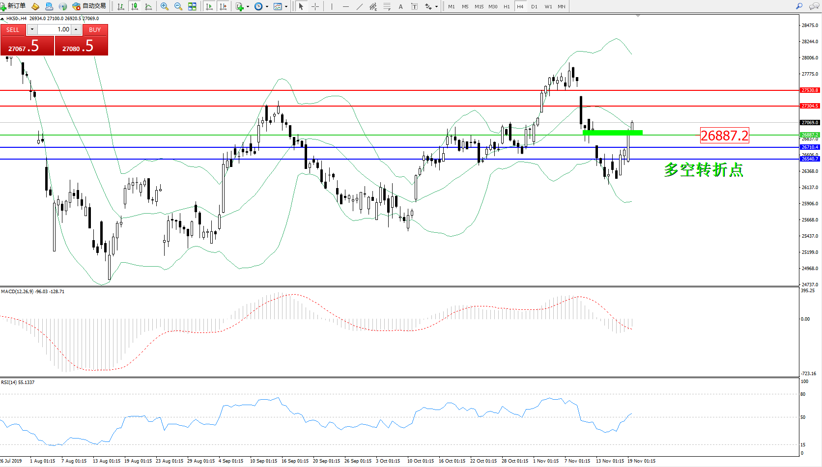 香港恒生指数11月19日(周二)收盘上涨412.71点,涨幅1.55%,报27093.80点;华为概念板块涨超5%,单日涨幅为10月31日以来最大。港股低开向下扩大跌幅至26605。低位见买盘涌出,企稳再造好,向上大幅抽升287点,恒指高见26968,直逼27000关口。恒指如期迎来反弹,而上涨的同时迎来成交量的放大,说明这样的涨势是较为积极可靠的。外围局势好转,摩根资产管理表示上调全球股市展望,主因中美两国贸易谈判有望取得突破,美国衰退风险降低,提振市场情绪。