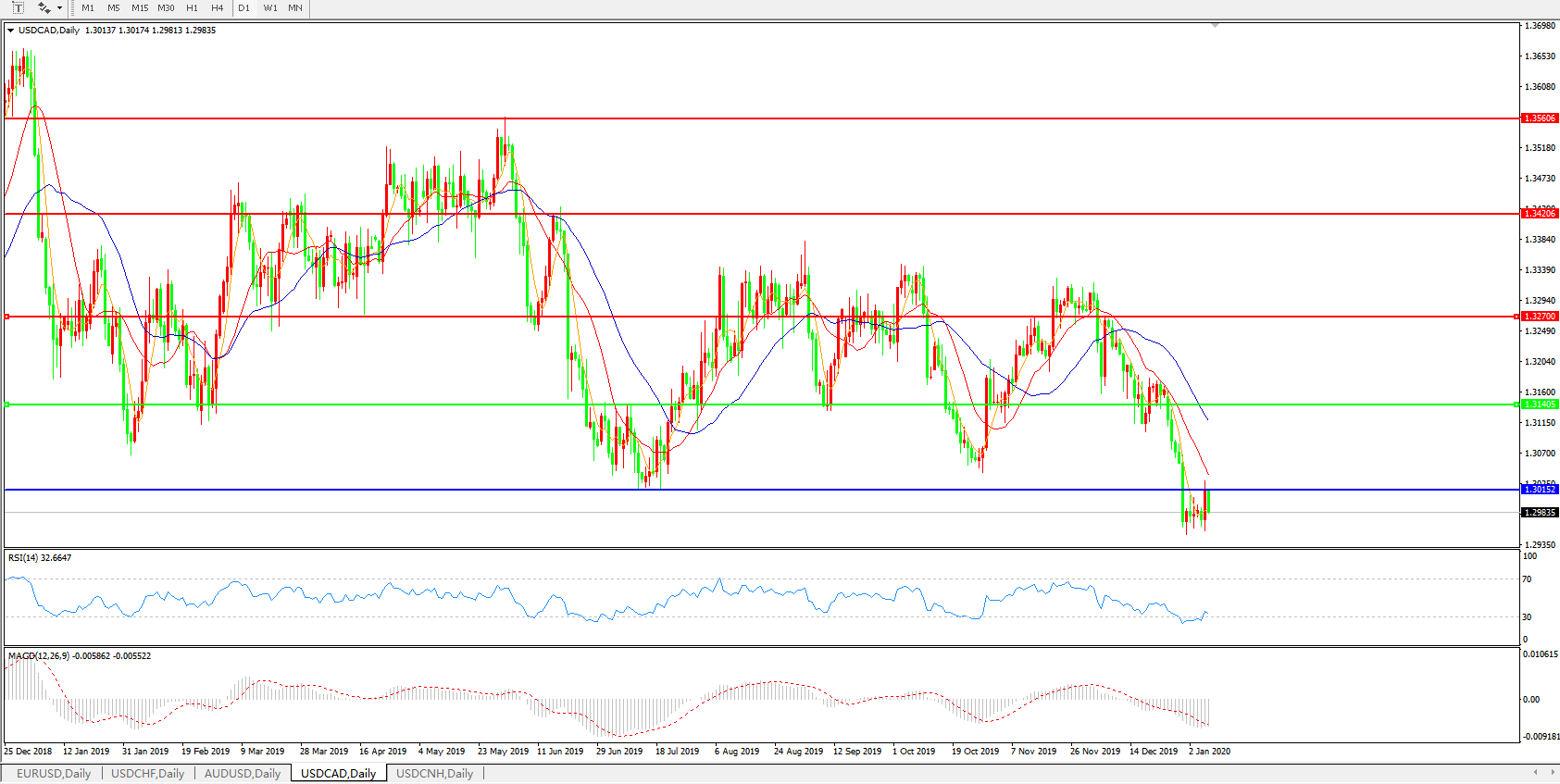技术面简析:日线图均线呈空头排列,汇价昨日小幅反弹早盘全部回吐,MACD持续下行且量能0轴下方再度加速放量,RSI震荡走低,预计汇价大概率将进一步下行。