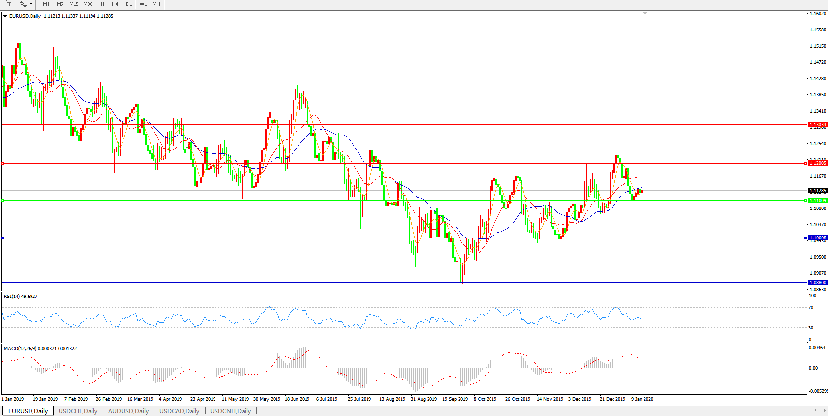 美元指数基本持平,盘中一度上涨0.2%,逼近12月27日以来的最高水平,但之后几乎回吐了全部涨幅。数据显示美国12月消费者价格指数上涨0.2%,低于预期的0.3%之后,美元指数回落;之后关税方面的报道,更是加剧了投资者的担忧,令美元指数进一步走低。周二发布的数据显示,美国12月消费者物价指数(CPI)小幅上涨,家庭支付的医疗费用增加,但核心通胀放缓,支持美联储维持利率不变至少到今年底的愿望。多伦多道明证券北美外汇策略主管Mark McCormick表示,贸易协议没有解决结构性问题,但至少对市场而言,它减轻了2019年全年困扰市场的一些压力、焦虑和不确定性。欧元兑美元跌0.05%至1.1128;盘中一度走强,因投资者继续出脱去年底投资组合再平衡操作中建立的看多欧元,看跌美元的头寸。由于投资者关注本周到期的执行价在1.1100的期权,该汇率一度跌至1.1104;盘中高位在1.1145;伦敦时段杠杆账户在1.1130上方的买盘减缓了汇率跌势。