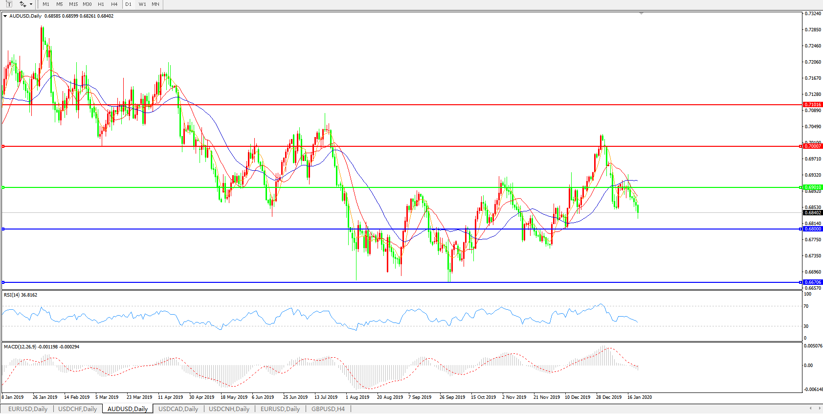 澳元兑美元汇价在周二延续颓势,跌至0.6844这一自12月18日以来的五周低位,因日内亚太地区股市因投资者对于突变公共卫生事件的顾虑而集体挫跌,并间接影响了全球市场风险情绪,这叠加澳洲本国的经济顾虑,令澳元再度成为G10货币中受冲击最深的避险; 虽然,澳大利亚森林火灾在该国近日大范围降雨之后已经很大程度得到缓解,但是该国经济所遭遇的冲击却仍需时间消化,因此澳洲联储2月降息的机率仍居高不下,这使得澳元汇价持续受压; 澳元兑美元日内支撑位在100日均线支撑位0.6841和前期低位0.6838,此后市场风险情绪的进一步变化将更受关注,而一旦失守该支撑,汇价将重新打开跌向0.68关口的通道,并进一步强化中期头部形态信号。