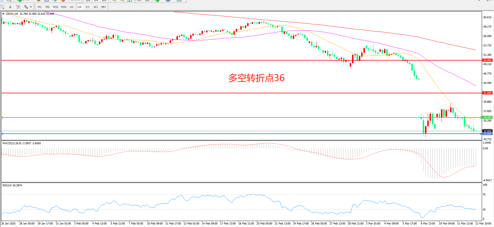 4小时图看,美油延续低位震荡,整体波幅不大,均线系统呈空头排列,MACD绿柱减少,RSI指标走平,延续震荡概率较大,短期反弹有望出现,中期走势仍然偏空。