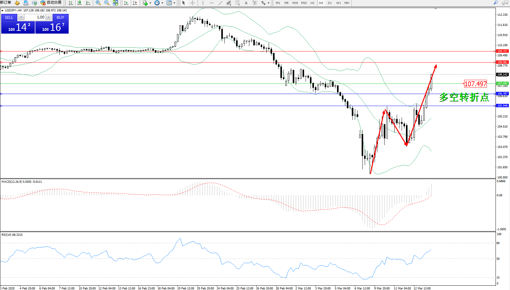 交易策略:107.497上方看涨,目标108.982109.757