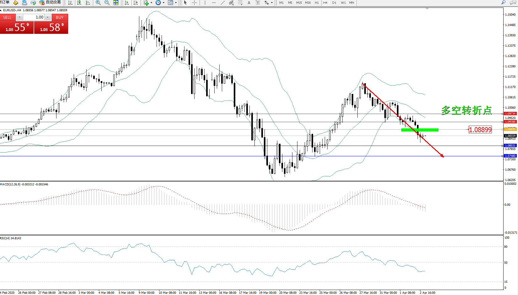 交易策略:1.08899下方看跌,目标1.08031、1.07480
